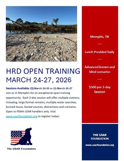 Join us in Memphis for an exceptional open training opportunity. Each 2-day session will offer multiple stations; including, large format remains, water searches, burned tissue, buried sources, distractions and cremains. Open to FEMA USAR handlers only.